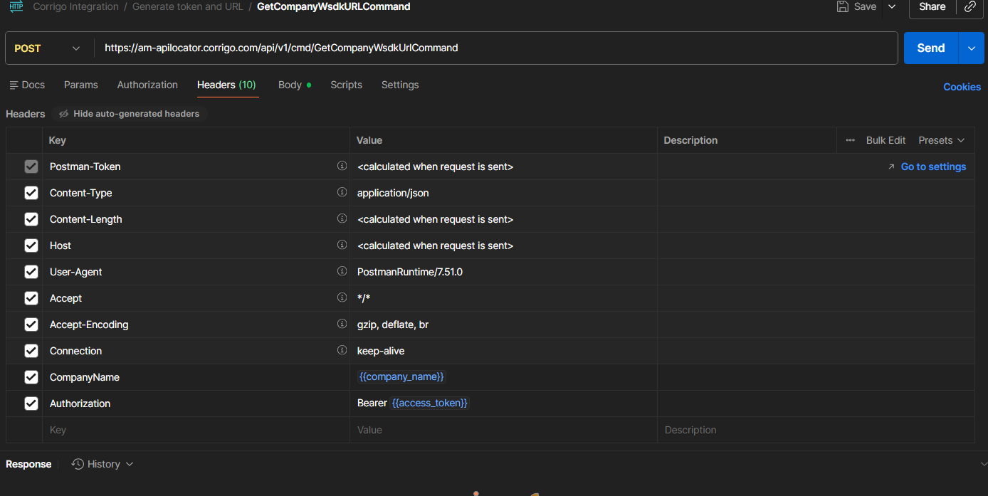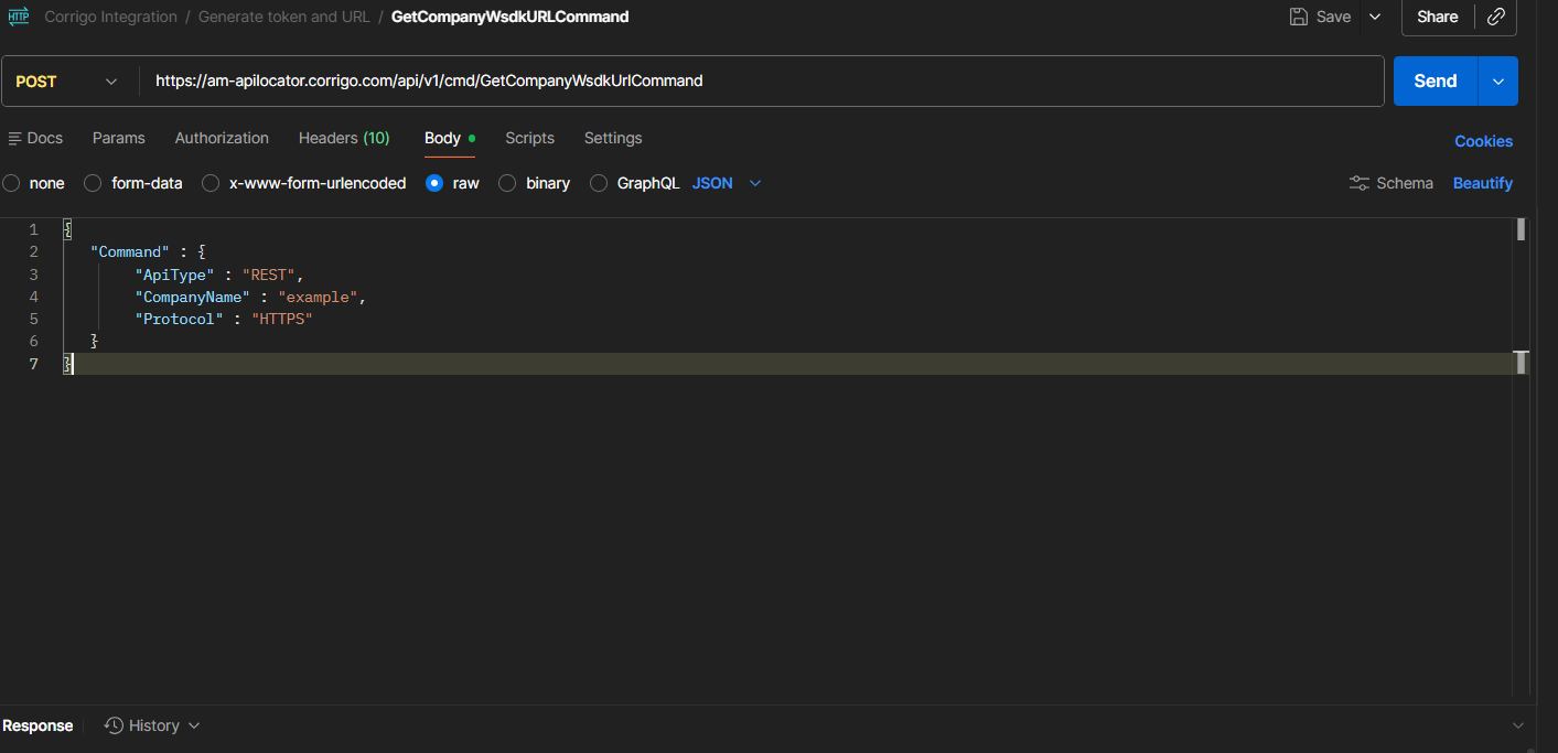 However, the API still returns a service URL successfully even when credentials for the specified company in the request body are not provided.