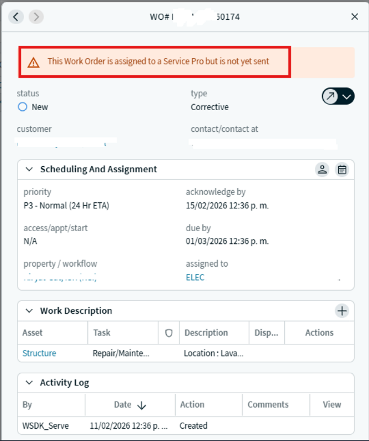 Please find the attached screenshot showing a work order that is created and assigned to a Service Pro but remains unsent.